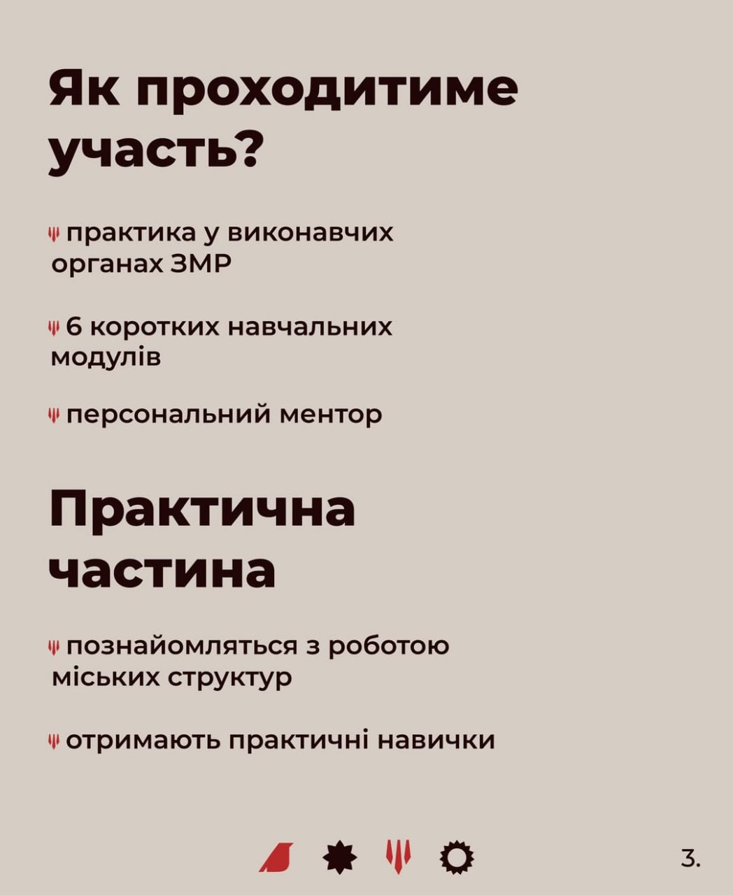 Це реальна можливість для тих, хто хоче не просто спостерігати, а бути частиною змін у місті: отримати реальний досвід у сфері місцевого самоврядування, публічного управління та громадської діяльності – з практикою, менторами й власними проєктами.