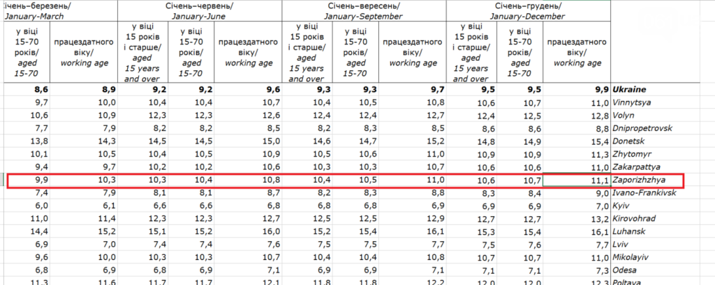 За даними Державної статистика, Запорізька область знаходиться на десятому місці за рівнем безробіття серед областей України.