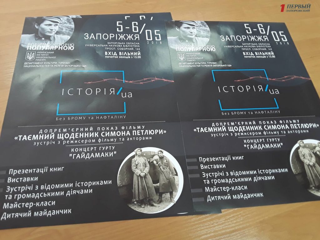 Примечательно, что организаторы готовят гостям и посетителям мероприятия особые сюрпризы. Так, 5 мая состоится презентация и допремьерний показ фильма “Тайный дневник Симона Петлюры” с участием актеров и режиссера ленты Олеся Янчука. Отметим, что выход фильма на широкие экраны запланирован только на осень, однако уже в начале мая запорожцы смогут бесплатно его посмотреть. Кроме этого, в воскресенье, 6 мая, для жителей города выступит известная украинская группа “Гайдамаки”. По словам организаторов, еще одной приятной неожиданностью станет мастер-класс по поиску документов в архивах СБУ.