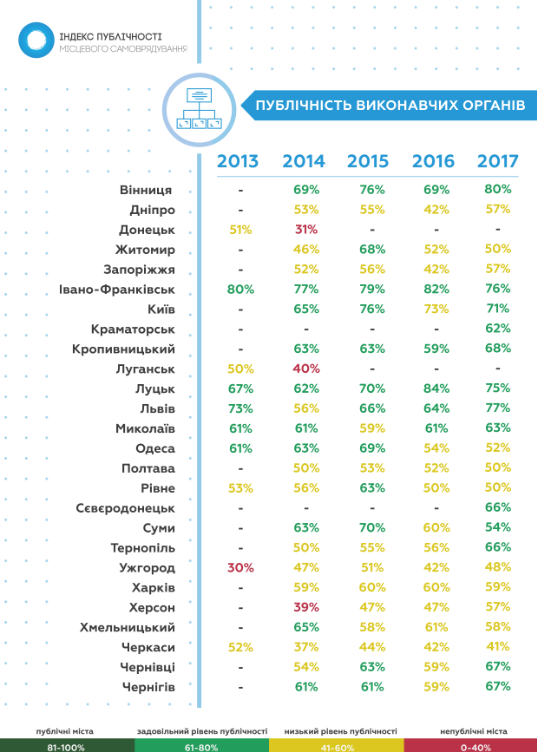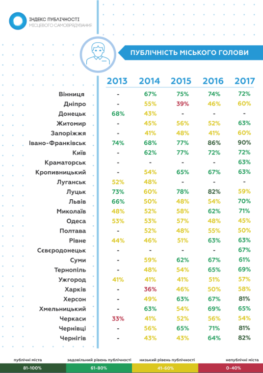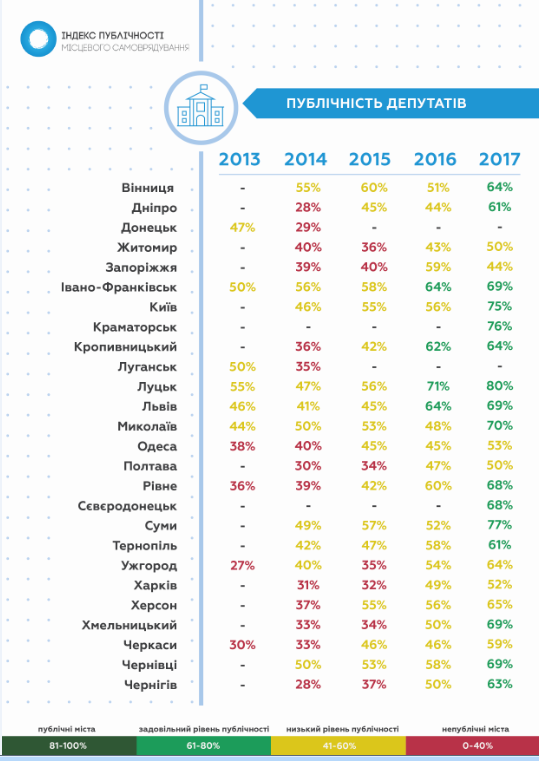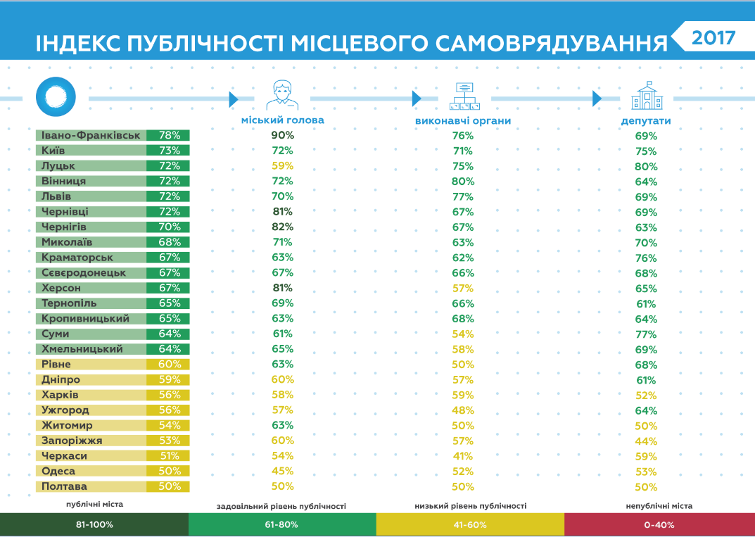 Индекс публичности органов местного самоуправления Запорожье в 2017-м вырос на 5% по сравнению с прошлым годом, что не позволило нашему городу выбраться из десятки не самых успешных в открытости в своей деятельности городов. Лидерами в этом направлении остаются муниципалитеты Полтавы, Одессы, Черкасс и Житомира.
