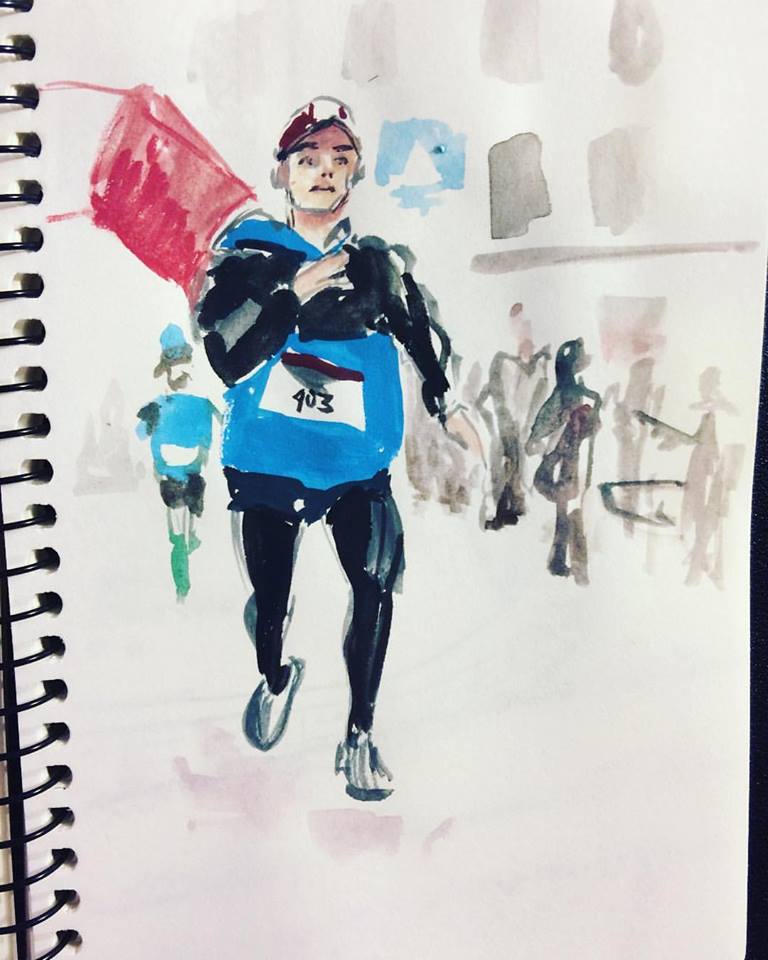 Почти все эскизы девушка рисовала простым карандашом в блокнот. Только один скетч с полумарафонцем по имени Максим был создан дома с помощью цветной гуаши.