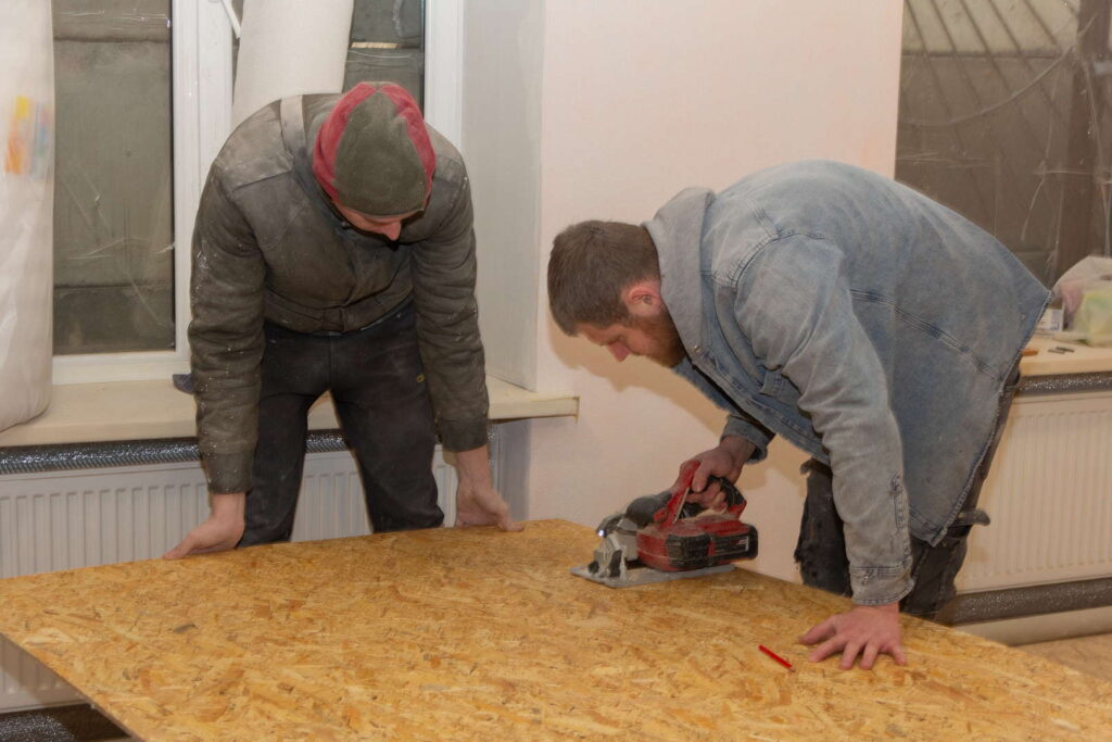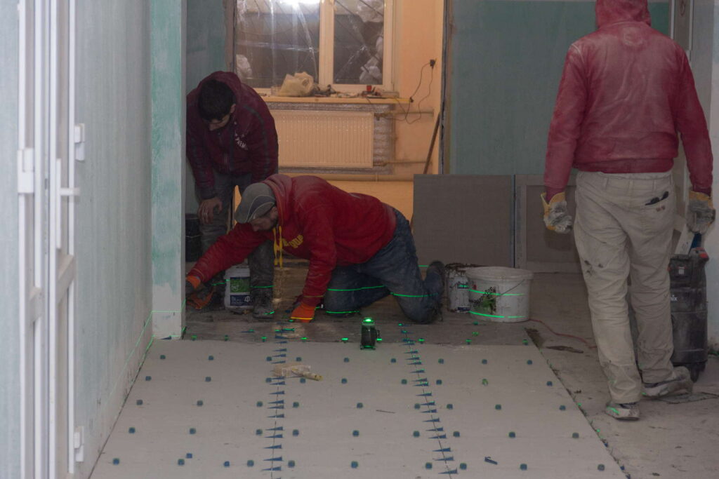 «На цей час виконано локальний ремонт стін та стелі, йдуть підготовчі роботи під фарбування. Демонтовано стару стяжку підлоги в коридорі і вже виконується облицювання плиткою. В навчальних класах йде ремонт основи та підлоги для подальшого монтажу лінолеуму», — розповів виконроб Денис.