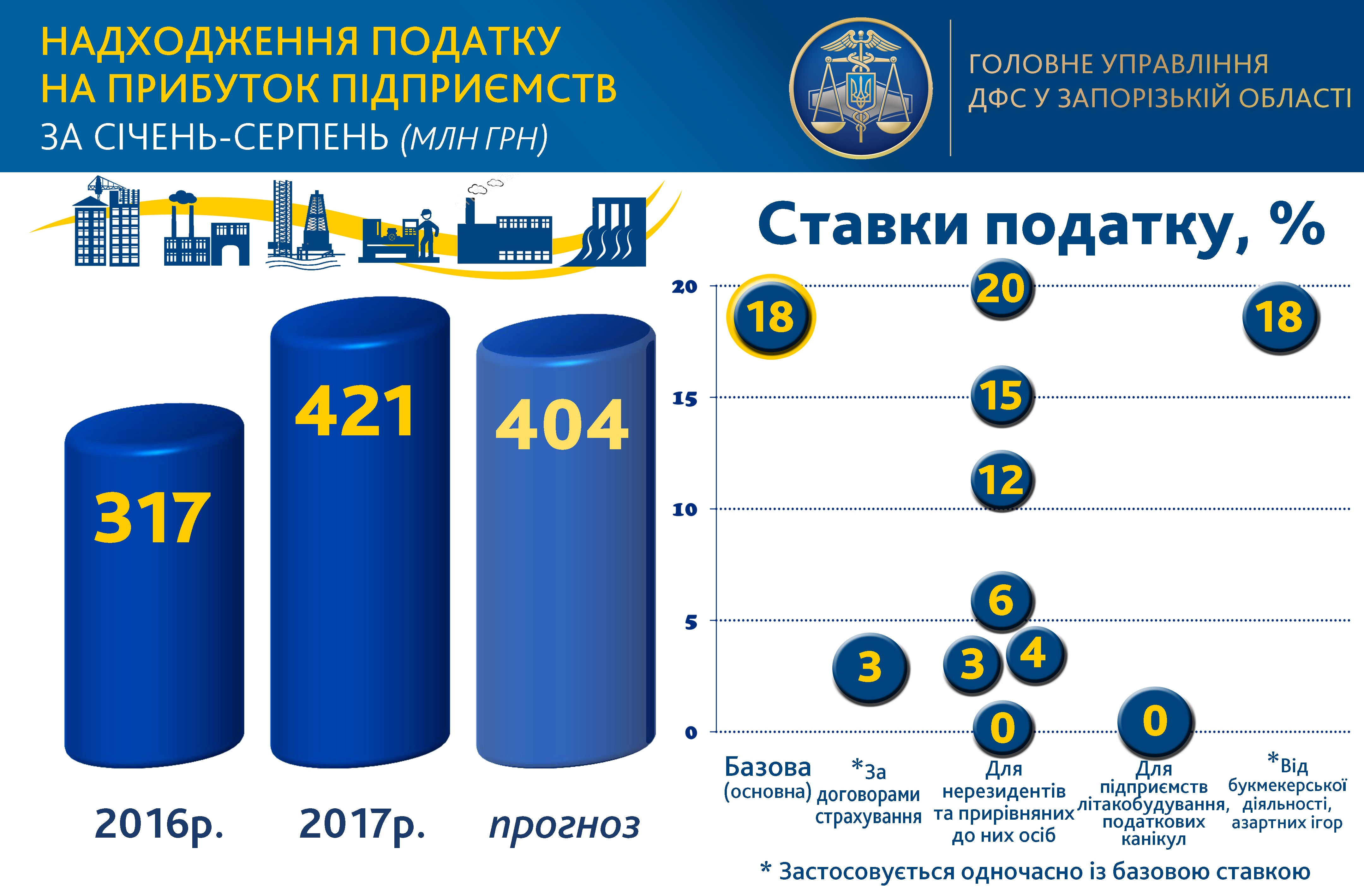 За январь-август 2017 года предприятия Запорожья и области направили в госбюджет 421 миллион гривен налога на прибыль (без показателей плательщиков, которые обслуживаются в Запорожском управлении Офиса крупных налогоплательщиков ГФС). Из этой суммы 84 миллиона или 20% были перечислены в августе.