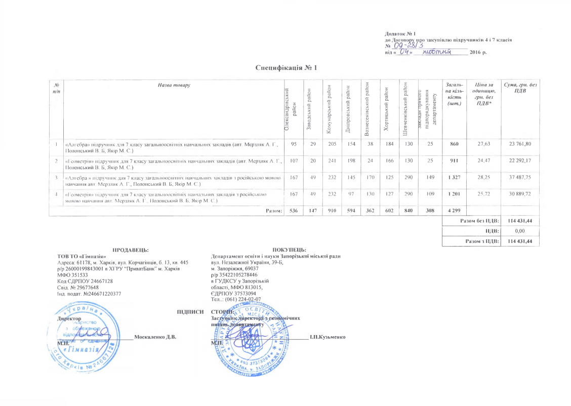 “Гимназия” должна закупить 4300 учебников для учеников 7-х классов общеобразовательных школ. Отчет о заключении соглашения опубликован в системе электронных закупок «Prozorro».
