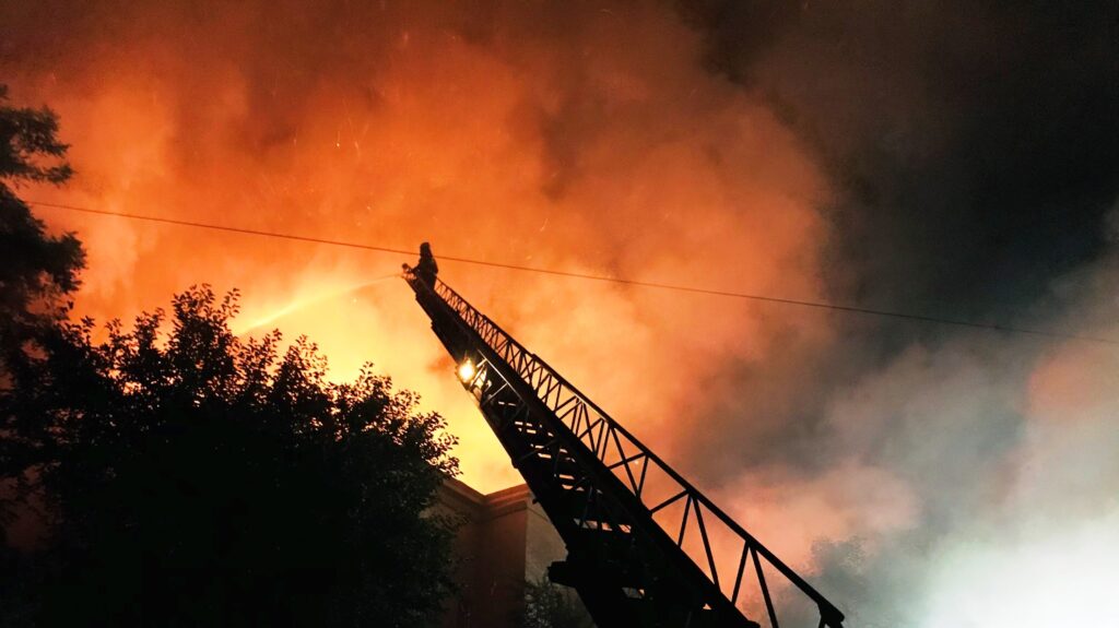 Гасіння пожежі відбувалося у двох напрямках: перший – ліквідація загоряння на даху, де було залучено 7 пожежних стволів, з них 2 лафетні; другий – захист квартир на четвертому поверсі, де було залучено 4 пожежні стволи.