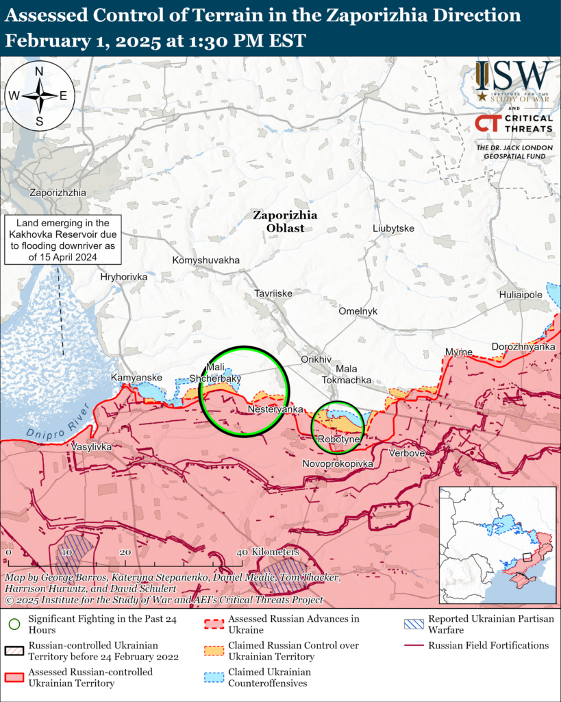 Також в ISW стверджують, що війська РФ нещодавно просунулися на північ від Роботиного Запорізької області на тлі продовження наступальних операцій на Запорізькому напрямку. У Генштабі ЗСУ 1 лютого опублікували карту, на якій зазначено, що окупанти просунулися на південь від Малої Токмачки.