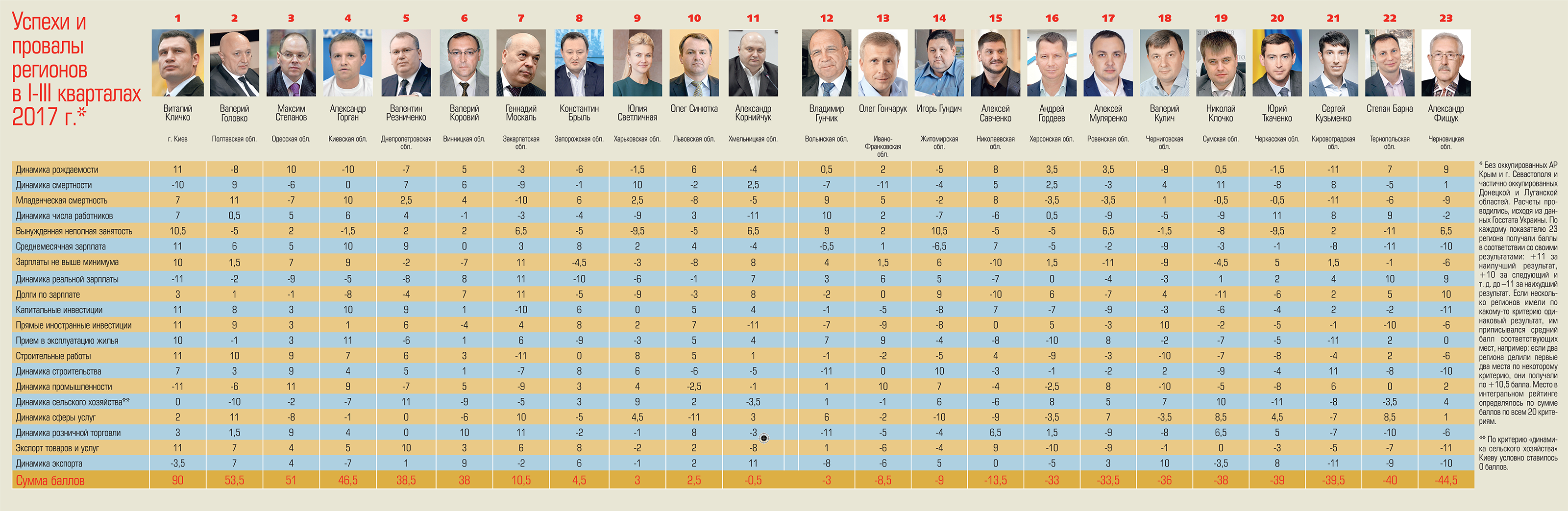 По каждой сфере главы регионов получили баллы в соответствии со своими показателями: +11 за наилучший результат, + 10 за следующий и т.д вплоть до -11 за худший показатель. Исходя из этого рейтинга, у губернатора Запорожской области суммарный результат составляет 4,5 балла.