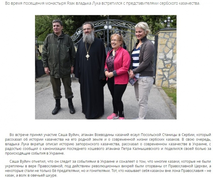 – Саша Вуйич отметил, что он следит за событиями в Украине и жалеет о том, что многие казаки, которые не были укреплены в вере Православной, под действием революционных вихрей были оторваны от Православной Церкви, а некоторые стали не только Ее предателями, но и гонителями. Тот, кто называет себя казаком вне лона Православия – не казак, а волк в овечьей шкуре , – говорится на сайте запорожской епархии УПЦ МП