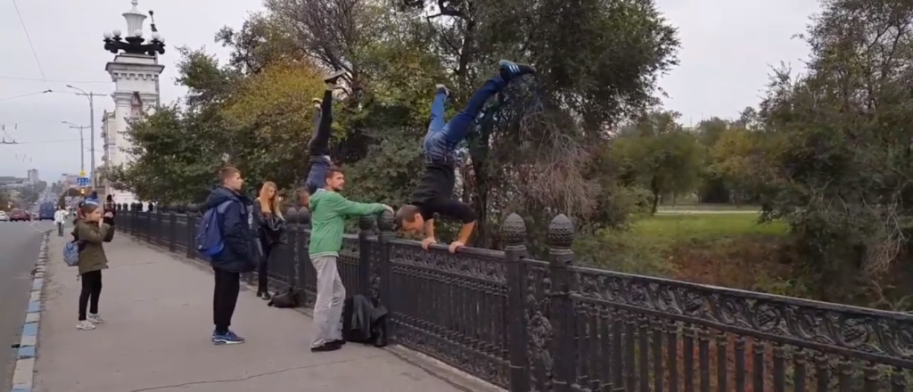 На центральном проспекте Запорожья небольшая группа молодых людей решила попрактиковаться в стойке на руках на поручнях моста.