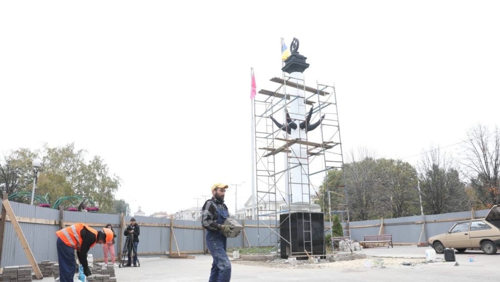 У парку Трудової Слави закінчується реконструкція вхідної групи з колонами. Підрядники змонтували нові стовпи, завершується підключення освітлення та благоустрій території.