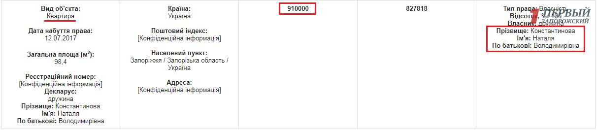 Глава фракции “БПП – Солидарность” в Запорожском городском совете Александр Константинов обнародовал свою свежую е-декларацию, в которой указал информацию о новой квартире жены.