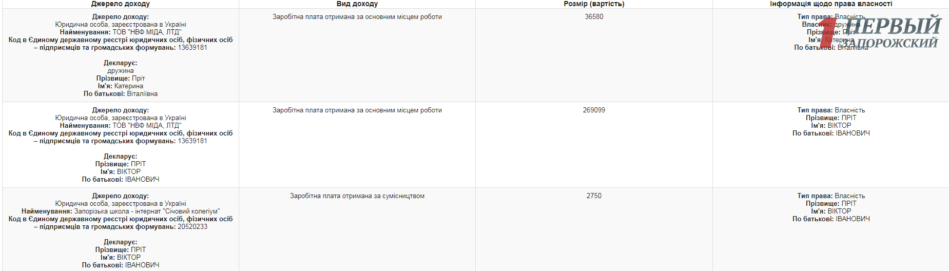 За год Виктор Прит заработал 3,7 миллиона гривен. Об этом он указал в своей е-декларации. Из этой суммы заработная плата только – 271 тысяча гривен, а более трех миллионов гривен составили дивиденды от «Научно-производственной фирмы «Мида ЛТД», где Виктор Иванович работает директором. Также из декларации известно, что бизнесмен занимает должность социального педагога в школе интернат «Сечевой коллегиум» и получает там скромную зарплату по совместительству.