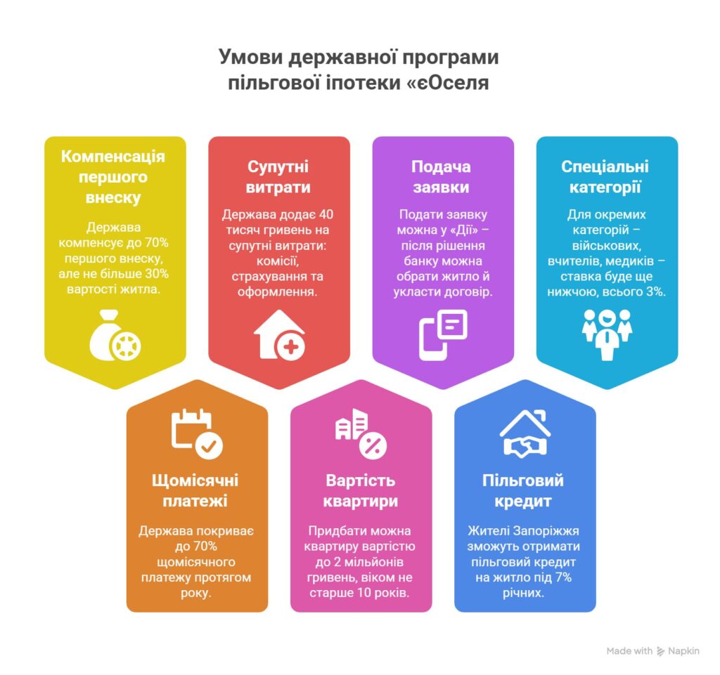 Жителі Запоріжжя зможуть отримати пільговий кредит на житло під 7% річних. Для окремих категорій – військових, вчителів, медиків – ставка буде ще нижчою, всього 3%.