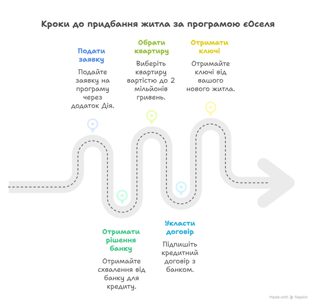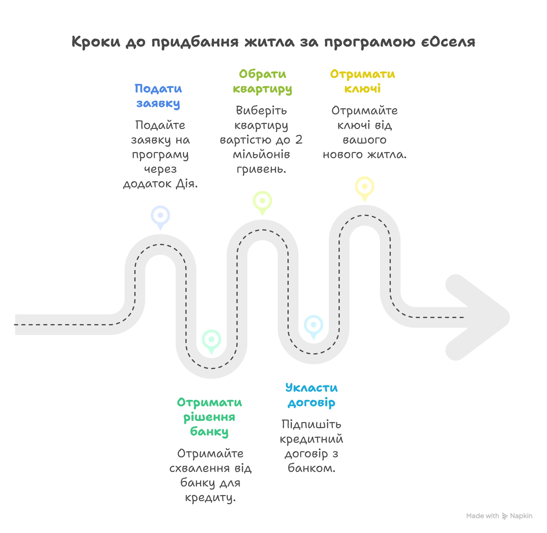 Придбати можна квартиру вартістю до 2 мільйонів гривень, віком не старше 10 років (для окремих категорій діють додаткові обмеження). Подати заявку можна у «Дії» – після рішення банку можна обрати житло й укласти договір.