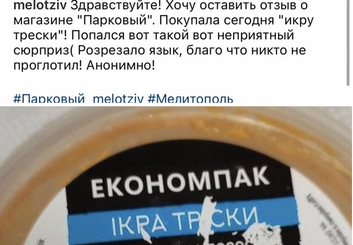 Місцева мешканка купила ікру тріски в одному з магазинів міста. Будинки під час трапези жінка розрізала собі язик, коли їла ікру. Як з’ясувалося, в баночці був неприємний сюрприз – металева скоба.