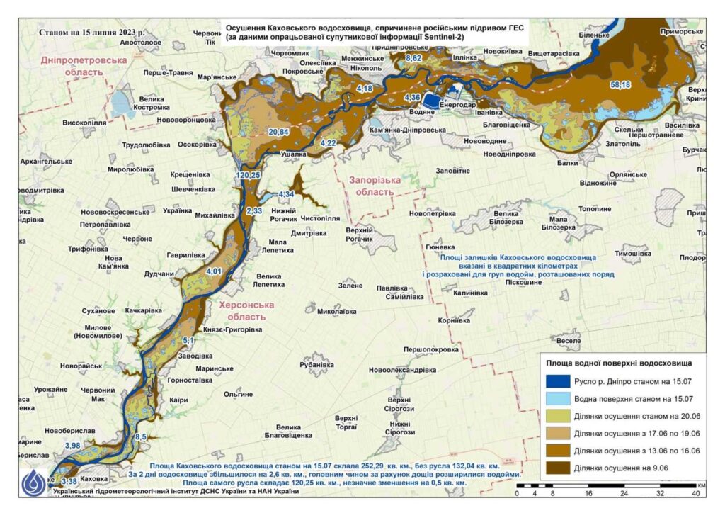 Станом на 15 липня , за оцінкою фахівців Українського гідрометеорологічного інституту ДСНС України та НАН України, внаслідок підриву ГЕС від загальної площі Каховського водосховища, яке становило 2065 км², залишилося 261,1 км² (відновлене русло та окремі озера), що становить лише 12,7% від його початкової площі.